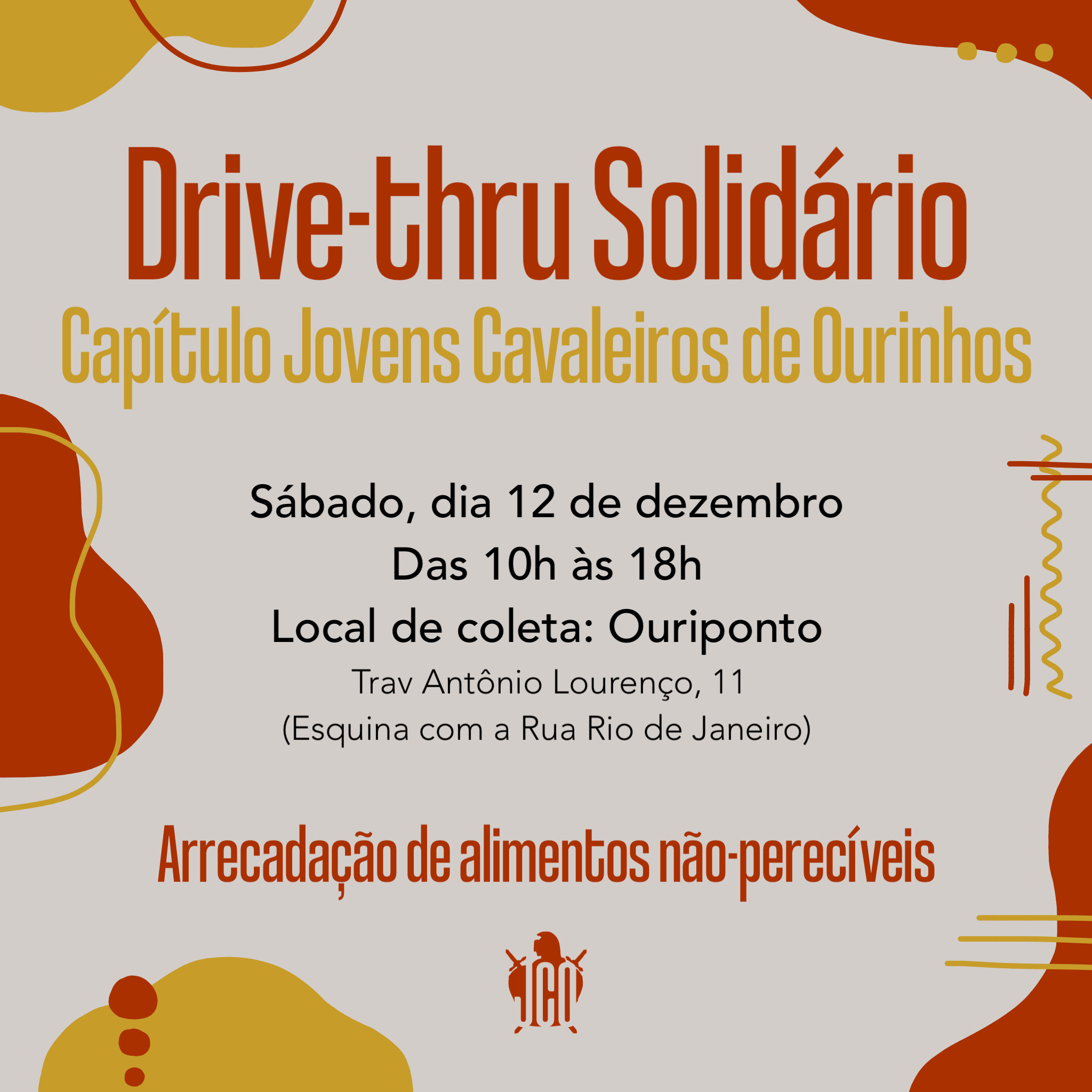 Drive-thru Solidário do Capítulo Jovens Cavaleiros de Ourinhos, ocorrido em 12 de dezembro de 2020. Foi realizada arrecadação de alimentos não-perecíveis junto à comunidade para doação de cestas de Natal!
